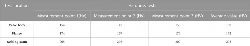 使用維氏硬度計(jì)(FALCON 600,INNOVATEST Co.,荷蘭)評(píng)估5號(hào)樣品的維氏硬度。測(cè)試結(jié)果如表1所示。結(jié)果表明,焊縫平均硬度為203HV,未觀察到異常現(xiàn)象。閥體硬度為150HV,法蘭硬度為172HV。這些硬度測(cè)試結(jié)果都在正常范圍內(nèi)。