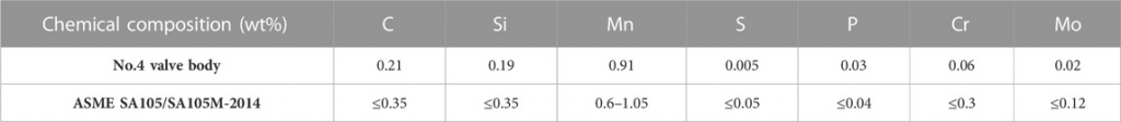 采用SPECTROMAX X光電直讀光譜儀(德國(guó)斯派克分析儀器公司)對(duì)閥體進(jìn)行化學(xué)成分分析。測(cè)試結(jié)果如表2所示。測(cè)試結(jié)果表明,閥體的化學(xué)成分符合ASME SA105/SA105M-2014的成分要求。