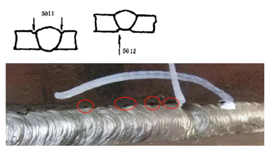 說明:因為焊接造成的焊趾(或焊根)處的溝槽。咬邊可能是連續(xù)的或間斷的。(GB/T6417  NO.5011/5012)