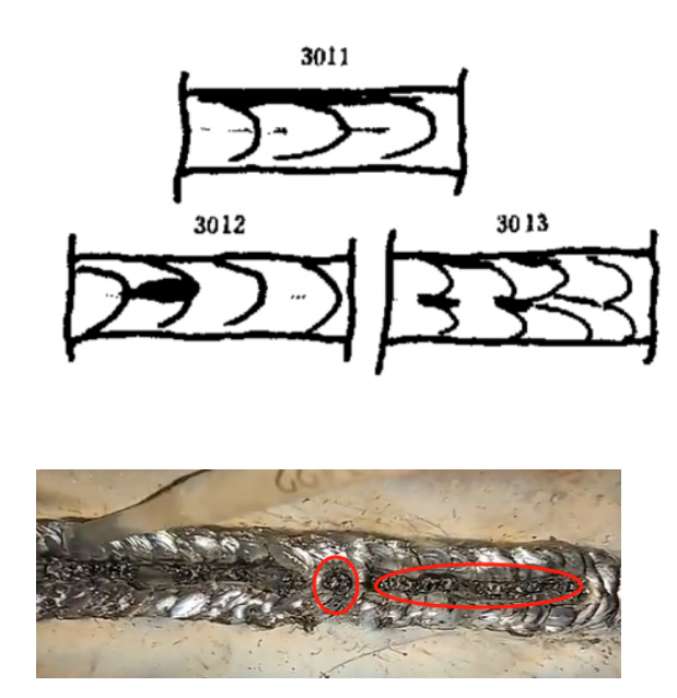 說明:殘留在焊縫中的熔渣,暴露在焊縫表面即為表面夾渣(GB/T6417  NO.301)